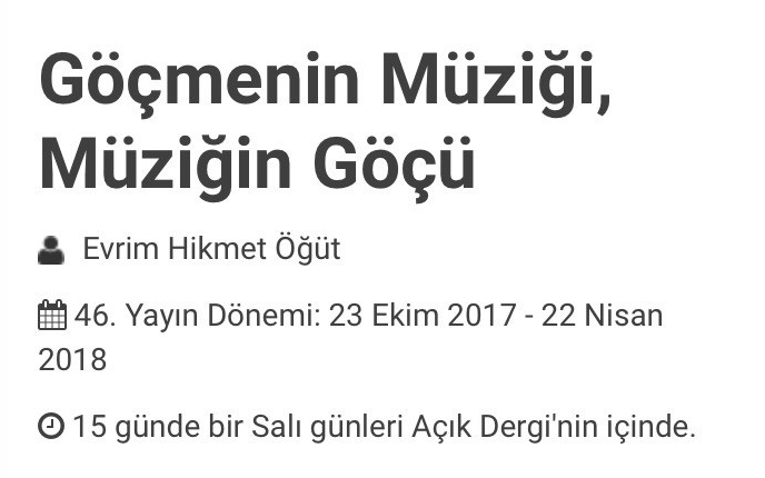 Açık Radyo için hazırlanan Göçmenin Müziği Müziğin Göçü radyo programının tamamına Spotify’dapodcast olarak erişmek mümkün. 26 Bölümlük programın her bir bölümünde bir araştırmacı/müzisyen bir konukla birlikte müzik ve göç ilişkisini farklı bağlamlarıyla ele alıyoruz.