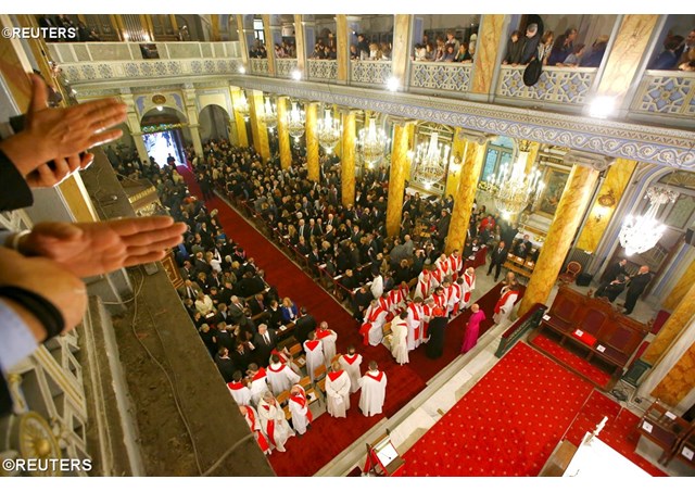 Harbiye’deki St. Esprit Katedrali, saklandığı duvarlar ardında pek göze görülmese de son derece görkemli bir yapı. Katedral o gün bu özel ayin için ek oturaklarla birlikte bin üç yüz kadar insanı ağırlıyordu. Bu bini aşkın insan, protokoldeki dini temsilcilerin dışında, her bir cemaate sağlanan belli sayıda davetiyeyi elde edebilmiş seçkinleriydi cemaatlerin. Sıkı güvenlik önlemleri alan ve ayin başlamadan bir saat önce girişleri kapatan polisin yanı sıra, cemaatler temsilcilerini kendi özel güvenliklerle de korumaya almışlardı. Dolayısıyla içeride her şey epeyce temiz, güvenli ve sterildi. Yine de cemaat temsilcilerinin geleneksel kıyafetlerinin görkemli renkliliğinin ve kilisenin her yanına yayılmış heyecanın bu steril havaya can kattığını atlamayalım.